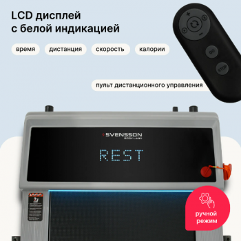 Svensson Body Labs IMPACT A — беговая дорожка, воплощающая стиль и технологии в новом светлом монохромном дизайне. Эта модель создана для домашних тренировок, сочетая современный минимализм, комфорт и надежность. Она идеально впишется в любой интерьер и станет надежным спутником на пути к здоровому образу жизни. Электрическая беговая дорожка оснащена бесщеточным двигателем Mitsubishi Motors Corporation с мощностью 1,5 л.с. и пиковым показателем 2,8 л.с., что обеспечивает плавный разгон скорости от 1 до 12 км/ч. Комфортное беговое полотно размером 105х41 см с толщиной 1,6 мм и парафинированной декой (12 мм) дополнено системой BlueLine Safety — ярко-синей подсветкой моторного отсека, которая обеспечивает визуализацию линии стопа для большей безопасности. Два уровня механического наклона полотна позволяют варьировать нагрузку, а LED-дисплей с белой индикацией отображает ключевые параметры тренировки. Для синхронизации с мобильными приложениями Spax™ и Kinomap™ предусмотрен встроенный Bluetooth. IMPACT A сочетает компактность, функциональность и готовность к использованию прямо из коробки. Вес тренажера составляет всего 27 кг, а в сложенном виде его размеры достигают 142х27х14 см, что позволяет хранить дорожку в вертикальном положении у стены. При этом дорожка выдерживает максимальный вес пользователя до 110 кг, что делает ее универсальным решением для всей семьи.